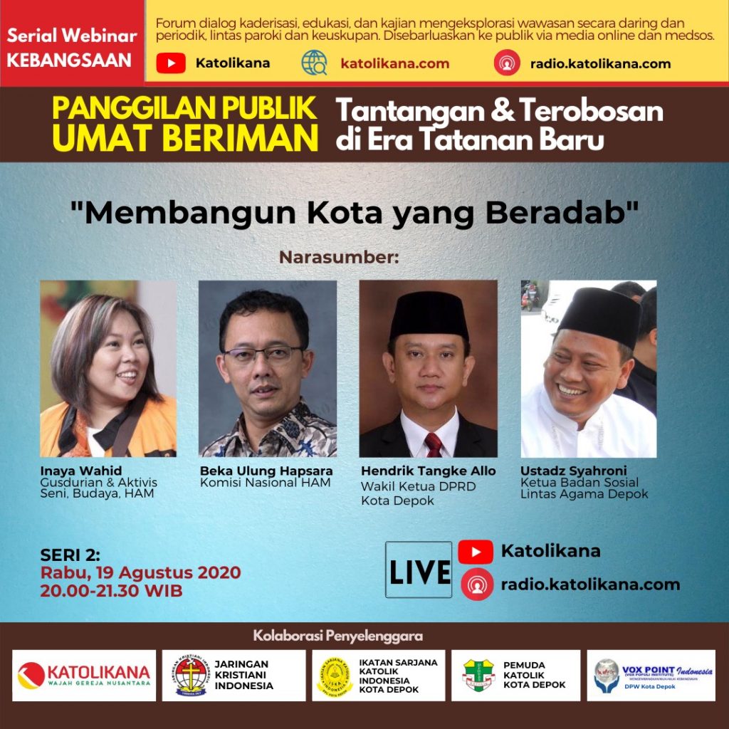 Seri kedua mengusung topik “Membangun Kota yang Beradab”. Seri ini berlangsung pada 19 Agustus 2020, pukul. 20.00-21.30 WIB. Para pembicara yang akan membahas topik tersebut adalah Komisioner Komnas HAM Beka Ulung Hapsara, Ketua Badan Sosial Lintas Agama (BASOLIA) Kota Depok Ustadz Syahroni, SE. Lalu, Pekerja Seni dan Pencinta Gus Dur Inaya Wulandari Wahid, dan Wakil Ketua DPRD Kota Depok Hendrik Tangke Allo.