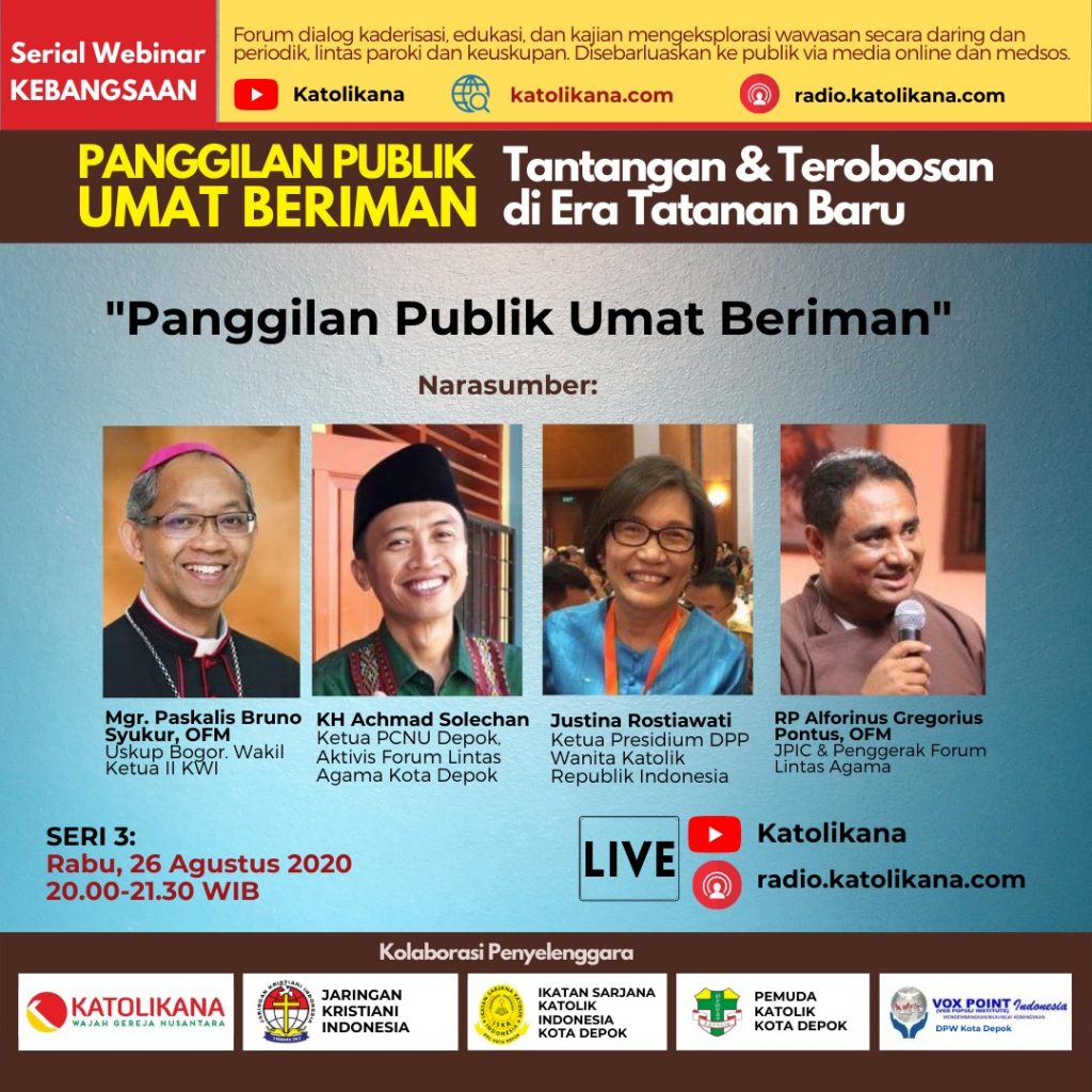 Seri ketiga mengangkat topik “Panggilan Publik Umat Beriman”. Sesi ini merupakan sebuah refleksi bersama lintas iman. Dalam sesi yang akan berlangsung pada 26/8, pkl. 20.00-21.30 WIB ini, Uskup Keuskupan Bogor Mgr. Paskalis Bruno Syukur OFM, Ketua PCNU Kota Depok Ahmad Solechan, Ketua Presidium DPP WKRI Justina Rostiawati, dan Sekretaris JPIC-OFM RP. Alferinus Gregorius Pontus, OFM.