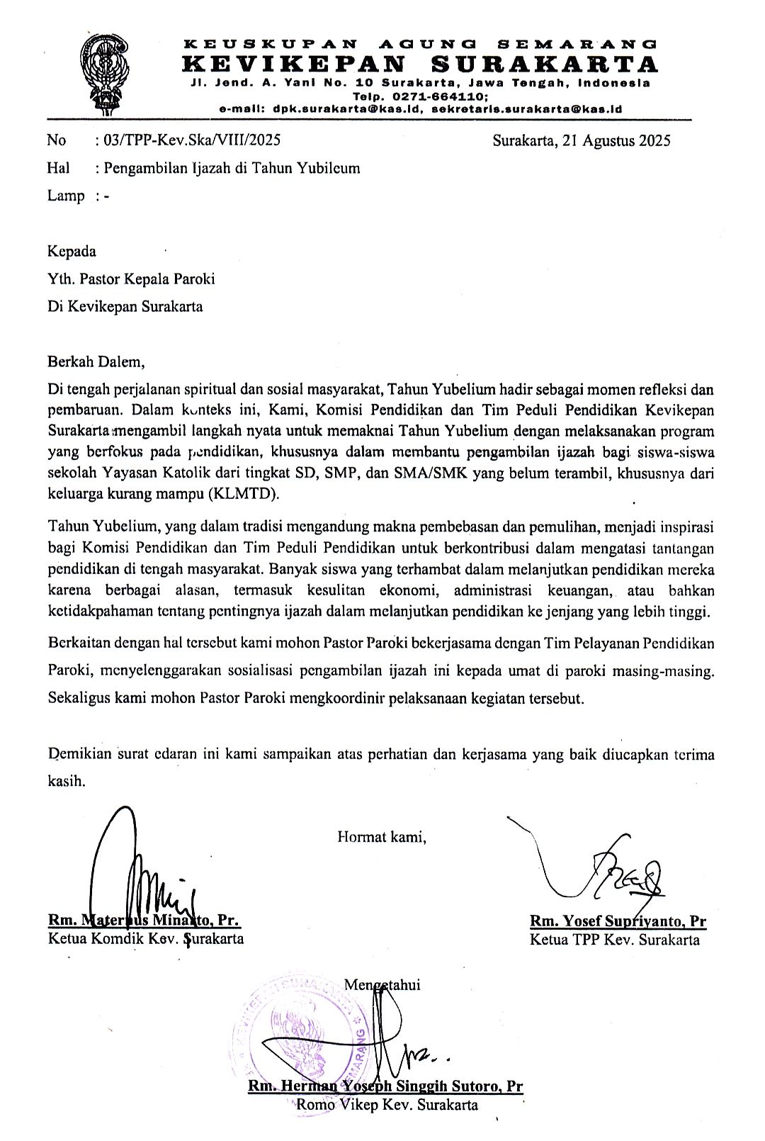 Surakarta, Katolikana.com – Memaknai tahun Yubileum, Komisi Pendidikan & Tim Peduli Pendidikan Kevikepan Surakarta memberikan bantuan pengambilan ijazah tingkat SD/SMP/SMA/SMK Yayasan Katolik bagi umat yang tidak mampu. Batas waktu sampai dengan tanggal 6 Januari 2026.