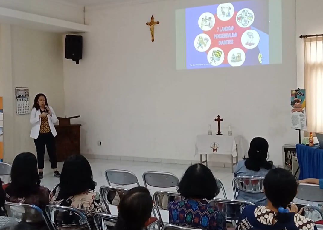Surakarta, Katolikana.com — Diabetes adalah penyakit kronis yang ditandai dengan tingginya kadar gula di dalam darah. Glukosa atau gula adalah sumber energi utama bagi tubuh. Namun, pada penderita diabetes, glukosa tidak dapat digunakan oleh tubuh dengan efektif. Kadar gula dalam darah diatur oleh hormon insulin yang diproduksi pankreas. Hormon ini membantu sel tubuh menyerap gula darah sehingga kadar gula darah tetap dalam batas normal. dr. Ova Rachmawati, Sp.PD menyampaikan hal ini dalam seminar kesehatan dengan tema “Hidup Sehat Bebas Diabetes: Kenali Gejala, Resiko dan Pencegahannya” di Gereja Santo Petrus Purwosari Surakarta, Selasa (14/10/2025). Seminar digelar dengan menggandeng RS Brayat Minulya Surakarta dengan nara sumber dr. Ova Rachmati, Sp. PD. Hadir pula dr. Elisabeth Susilawati, MM Kepala Bidang Humas dan Marketing RS Brayat Minulya. Diabetes tidak bisa disembuhkan Mengapa perlu tindakan untuk mengendalikan diabetes? Menurut dr. Ova Rachmawati, karena diabetes tidak bisa disembuhkan namun hanya bisa dikendalikan. Gejala-gejala yang sering timbul