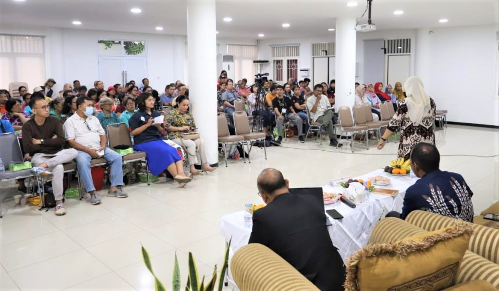 Diskusi menghadirkan dua narasumber utama: Sri Suparyati (Wakil Ketua LPSK RI) dan Romanus Ndau (Akademisi), dengan GM. Eko Wahyudono (Pegiat HAAK Paroki Cijantung) sebagai moderator.