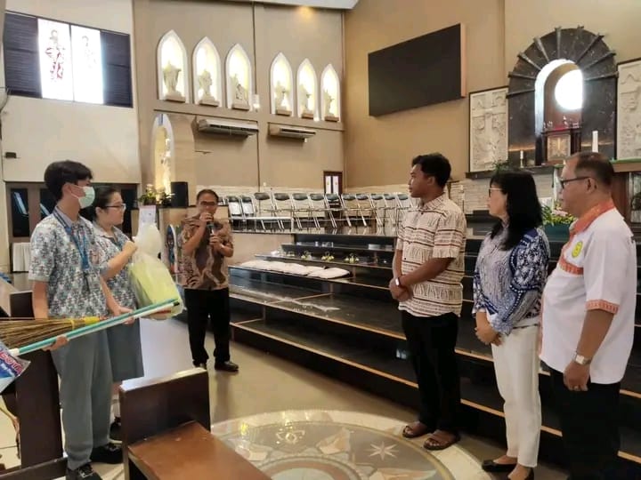 Setelah berfoto bersama, para siswa dengan antusias melaksanakan aksi kebersihan di lingkungan gereja dan sekitarnya, menunjukkan semangat kebersamaan dan toleransi dalam bingkai persatuan.