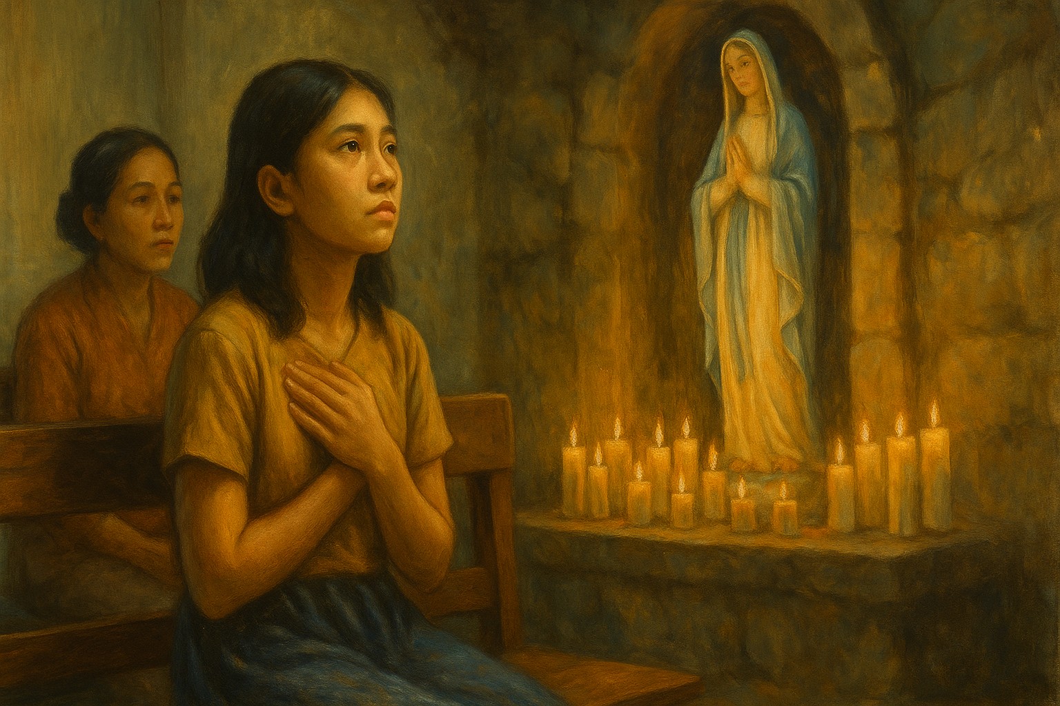 Patung Maria yang tersembunyi dalam gua itu seolah menatapnya dengan penuh kasih sayang. Ada ketenangan yang datang setiap kali ia berdoa di sini.