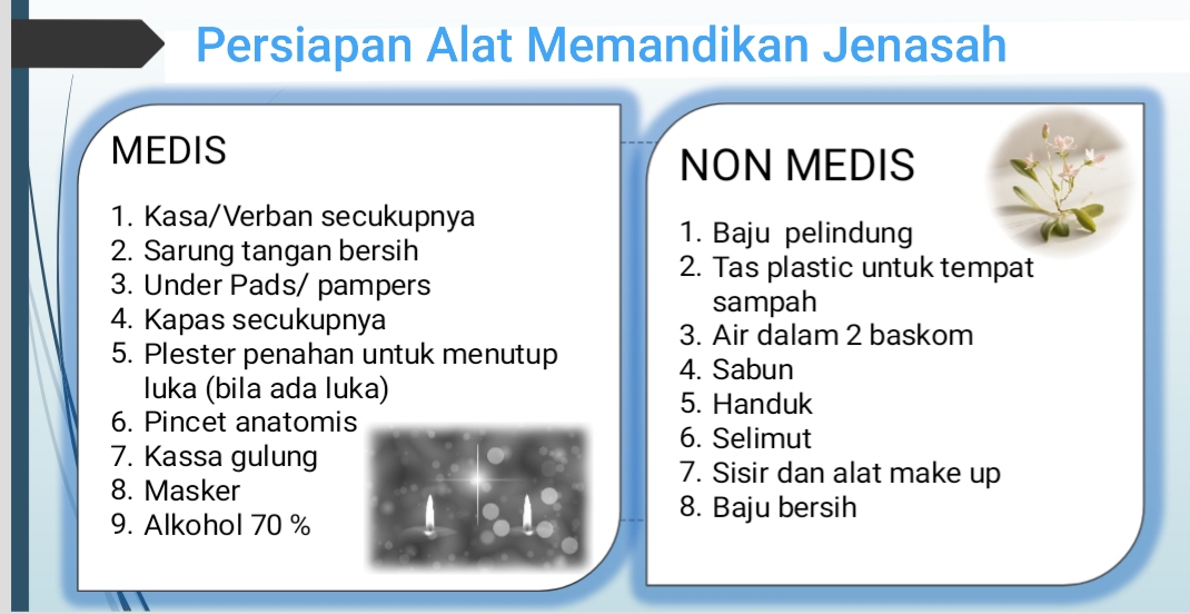 - Melakukan komunikasi saat merawat jenazah. Jenazah pun perlu diajak komunikasi. Contoh “Mohon maaf Bapak/ibu …, mau menghadap Tuhan Yesus, mandi dulu ya agar badan bersih dan wangi”