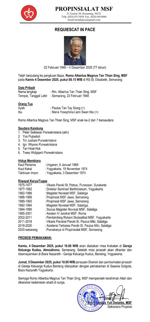 Yogyakarta, Katolikana.com — Langit Semarang tampak sendu pada Rabu, 4 Desember 2025. Kabar duka itu datang bagai angin yang menyentuh daun-daun kenangan: Rama Albertus Magnus Tan Thian Sing, MSF, seorang Misionaris Keluarga Kudus yang rendah hati, telah berpulang ke Rumah Bapa.