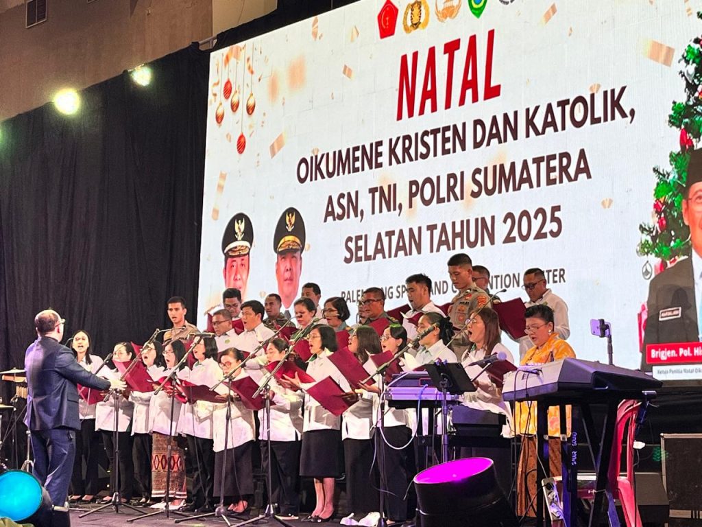 Penampilan paduan suara gabungan ASN, TNI-Polri mengisi acara Natal Oikumene Provinsi Sumatera Selatan 2025 ( Foto; Daris)