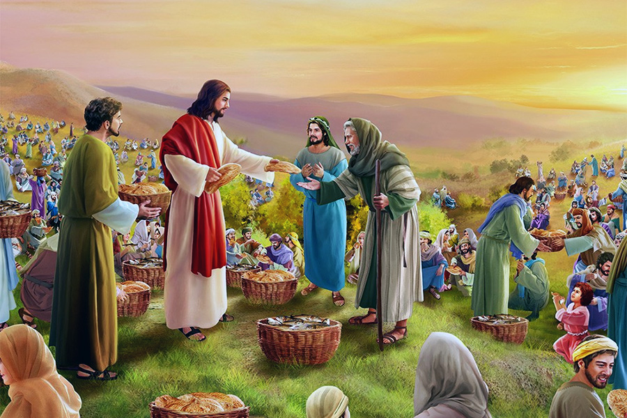 Ada detail yang kuat: orang banyak disuruh duduk berkelompok di rumput hijau. Ini bukan sekadar pengaturan logistik. Ini gambaran gembala yang menuntun kawanan ke padang rumput. Lalu Yesus mengambil roti, mengucap berkat, memecah-mecahkannya, dan memberikannya. Ini terdengar sangat ekaristis: pola yang kelak kita kenal di perjamuan terakhir—dan terus kita rayakan di altar.