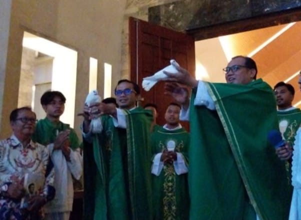 RD Hyginus Gono Pratowo dan RD Dionesius Anton Liberto saat melepaskan burung merpati lambang penyertaan Roh Kudus pada HUT ke-59 Paroki Santo Yoseph Palembang
