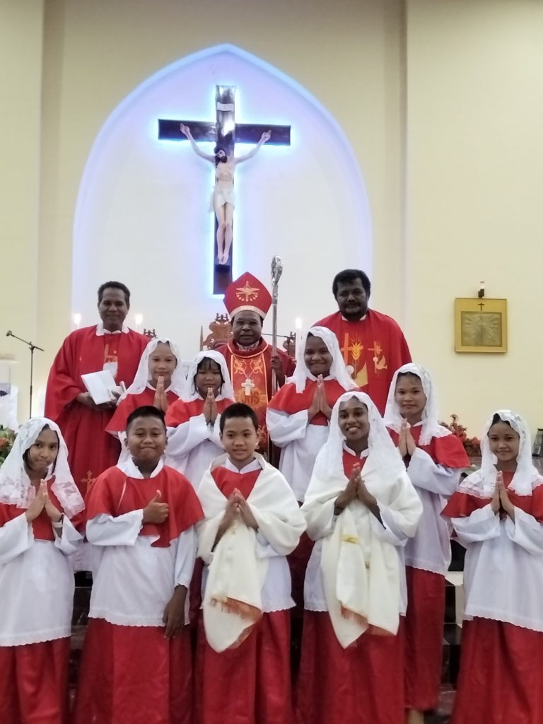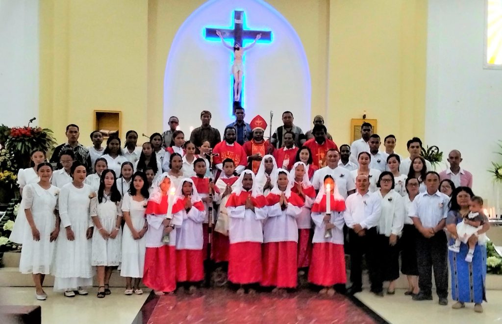 Perayaan Krisma di Paroki Kristus Raja berlangsung dengan kehadiran umat dari stasi-stasi dalam wilayah paroki. Para wali Krisma turut mendampingi peserta penerima Sakramen, sementara umat memadati gereja hingga perayaan selesai. (*)