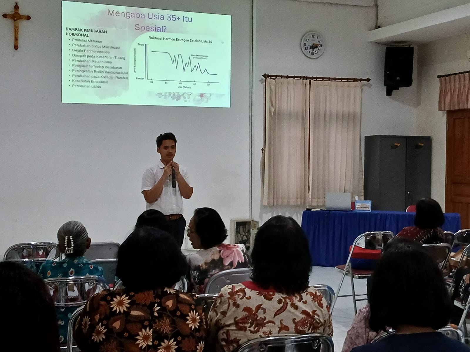Narasumber dr. Daniel Dwi Nugroho, Sp.OG dari RS Brayat Minulya Surakarta mempresentasikan seminar kesehatan ini dengan topik ” Masa Peralihan yang Penuh Berkat; Tetap Sehat di Usia Emas; Memahami Perdarahan Abnormal dan Tanda Bahaya Paska Menopause.”
