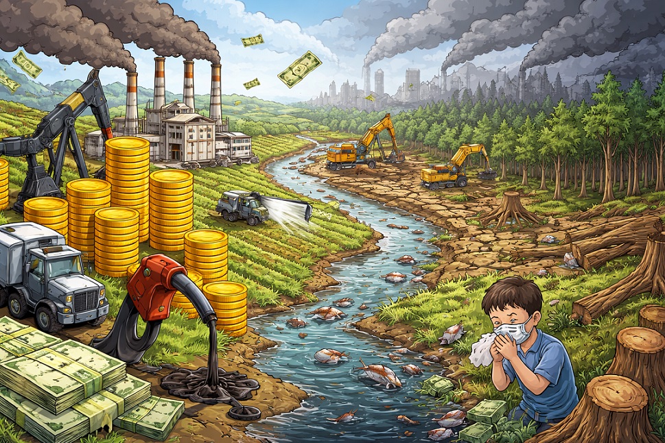 Ia membuat aktivitas yang merusak alam terasa “murah”, sementara biaya sesungguhnya—polusi, krisis kesehatan, hilangnya hutan, rusaknya air dan tanah—dipindahkan diam-diam kepada publik dan generasi berikutnya.