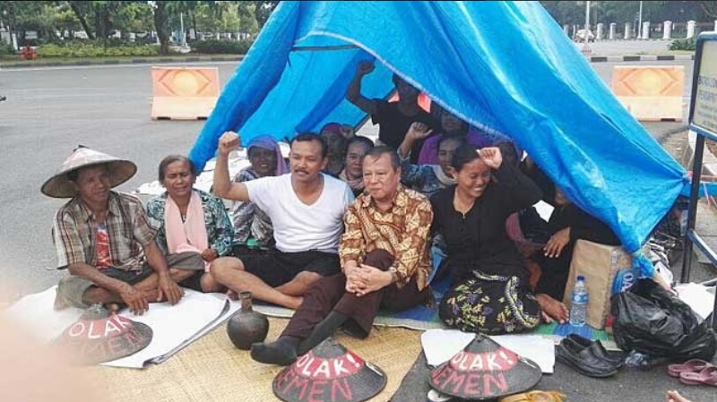 Uskup Agung Keuskupan Jakarta Mgr. Ignatius Suharyo mengunjungi tenda ibu-ibu yang berdemo menolak rencana pembangunan pabrik semen di kawasan Pegunungan Kendeng, Jawa Tengah. Demo dilakukan di depan Istana. Foto: Tempo (5/10/2019).