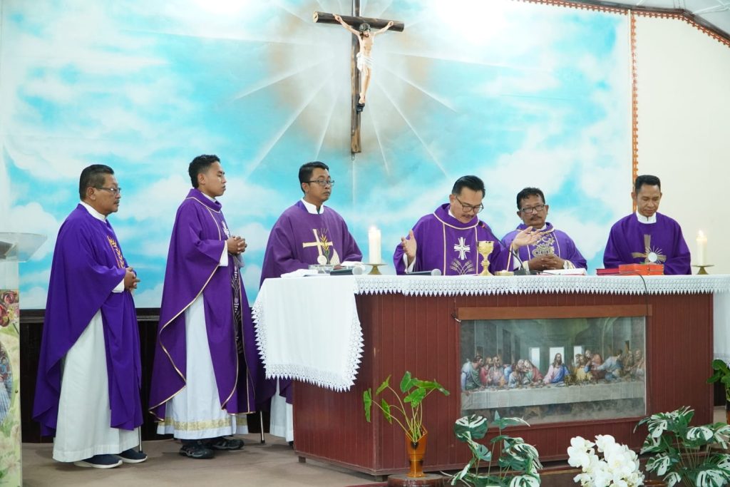RD Yohanes Kristianto Vikjen Keuskupan Agung Palembang memimpin ekaristi pembukaan kegiatan sosialisasi tanggap darurat di Wismalat Podomoro Jumat,(13/3/2026)