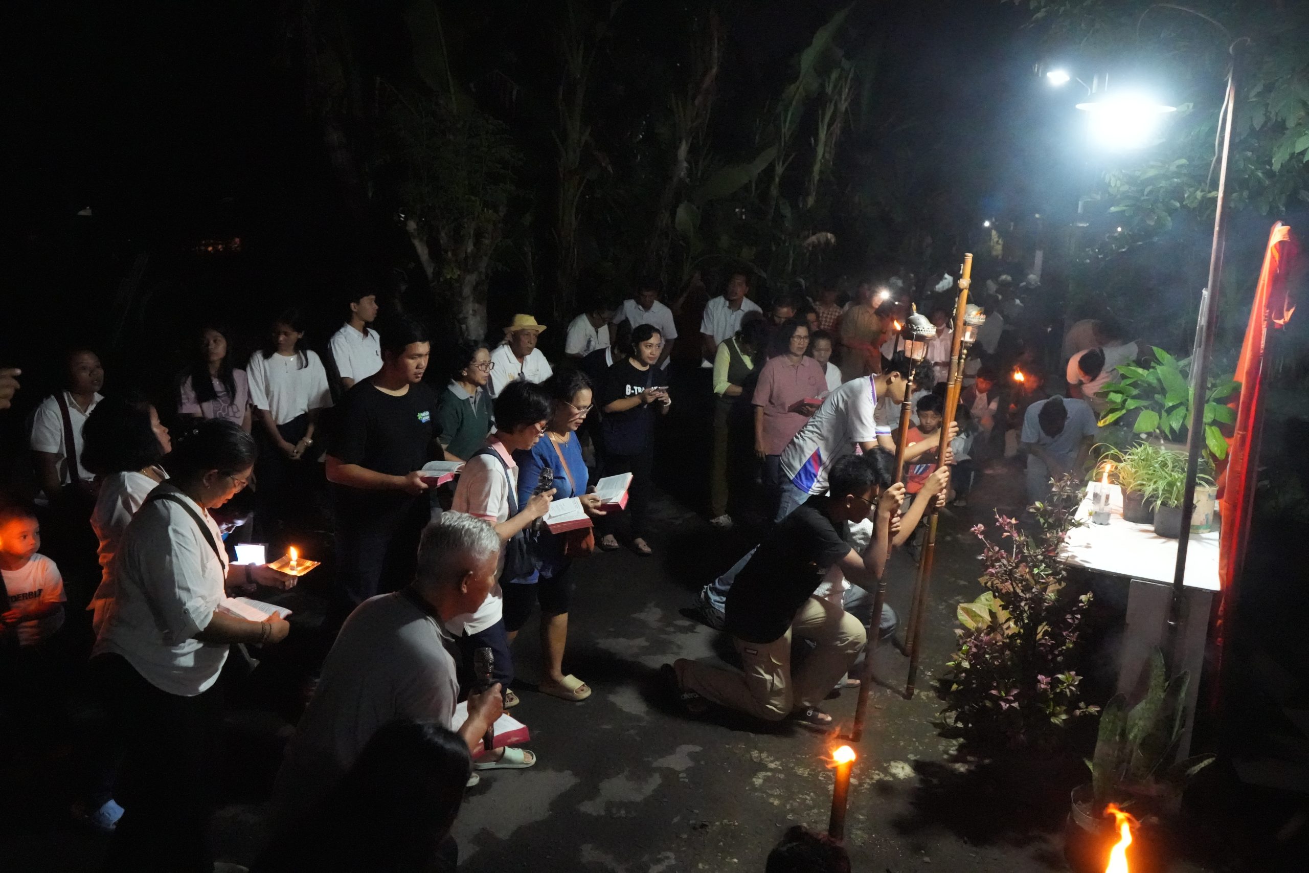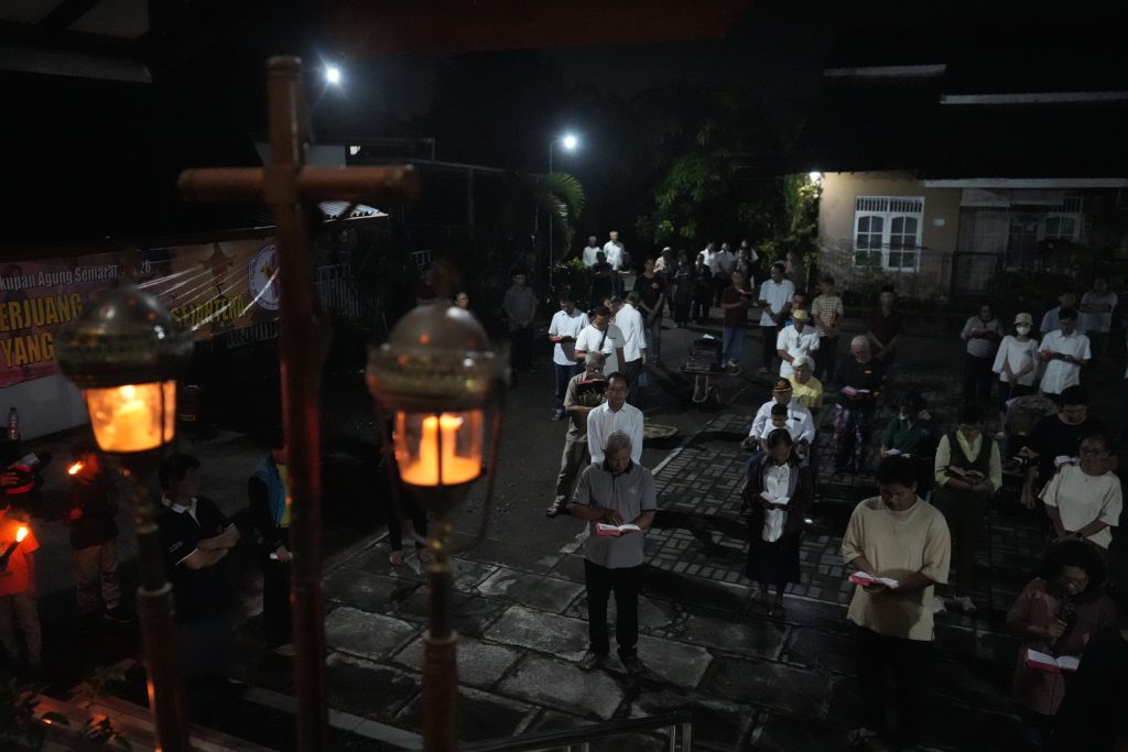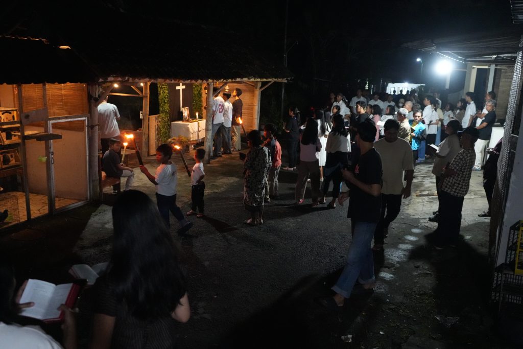 Yogyakarta, Katolikana.com – Tidak seperti biasanya, Ibadat Jalan Salib ini dilakukan pada malam hari usai perayaan Kamis Putih. Uniknya, Jalan Salib ini juga dilakukan dangan berkeliling kampung melintasi 14 titik perhentian kisah sengsara Yesus.