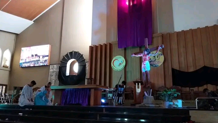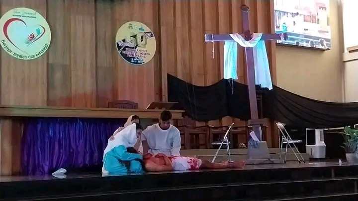 Visualisasi ketika Bunda Maria memangku jenasah Yesush setelah diturunkan dari kayu salib pada tablo OMK Paroki St Yoseph Palembang Jumat, (3/4/2026)