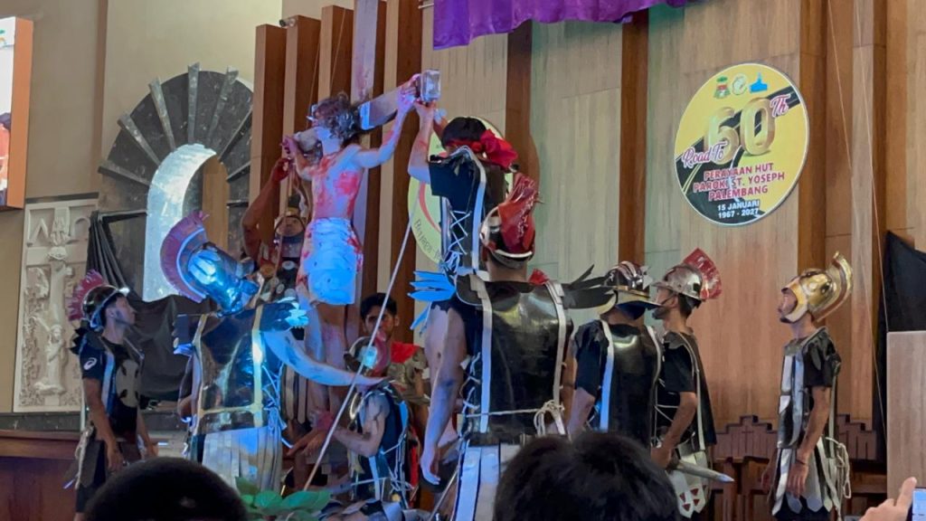 PALEMBANG, Katolikana.com  – Suasana haru menyelimuti Gereja Santo Yoseph Palembang pada Jumat Agung (3/4/2026). Ratusan umat Katolik larut dalam perenungan mendalam saat menyaksikan pementasan Tablo Kisah Sengsara Yesus Kristus. Dramatisasi yang dibawakan oleh Orang Muda Katolik (OMK) ini menjadi sarana visualisasi Jalan Salib guna membantu umat menghayati betapa besar pengorbanan Tuhan Yesus demi menebus dosa manusia.