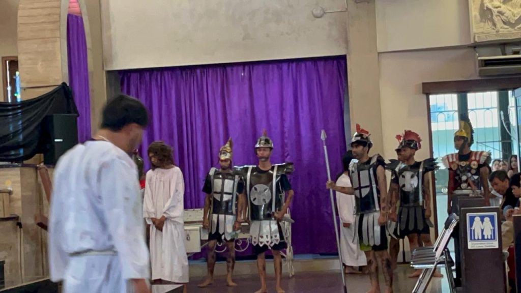 Visualisasi saat Yesus dihadapkan kepada Ponsius Pilatus pada Tablo OMK Paroki Santo Yoseph Palembang Pkl 09.00 Jumat, (3/4/2026)