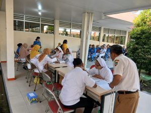 Hadir dari Dinas Kesehatan Kota Surakarta Petugas Medis Puskesmas Manahan di RS Brayat Minulya Surakarta untuk melakukan pemeriksaan deteksi dini faktor risiko pada pegawai RS Brayat Minulya.