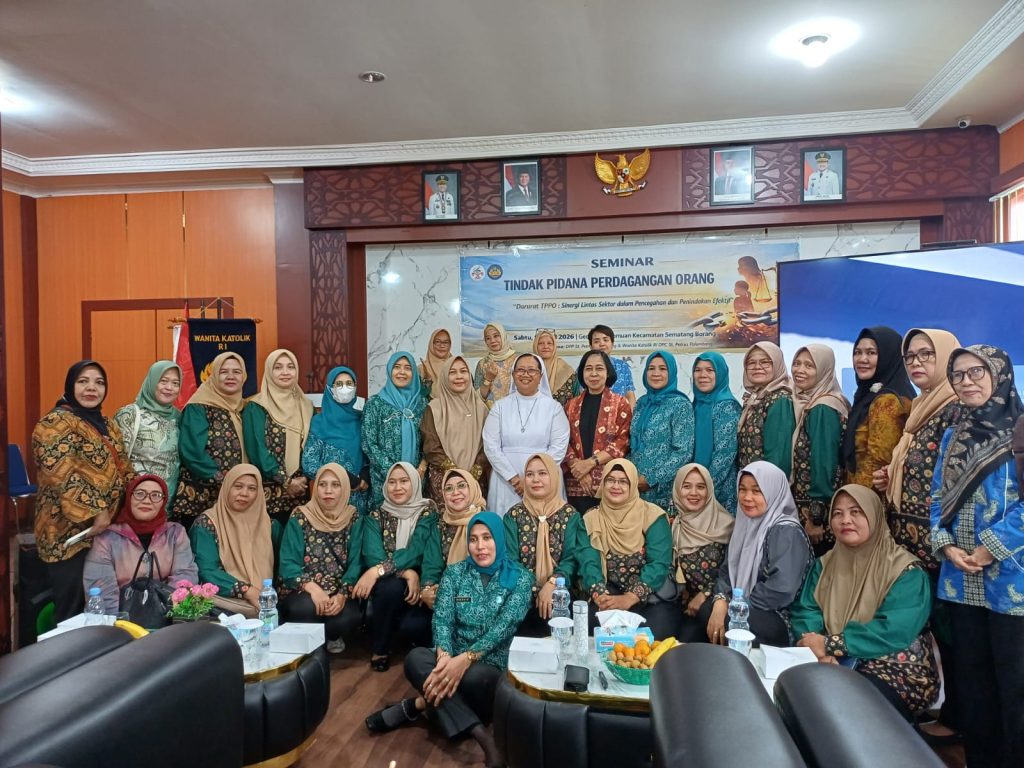 PALEMBANG, Katolikana.com – Dewan Pastoral Paroki (DPP) St Petrus Palembang bersama Wanita Katolik Republik Indonesia (WKRI) DPC St. Petrus Palembang dengan Seksi Kerasulan Awam (Kerawam) dan Seksi Kewanitaan menggandeng Komisi Gender Pemberdayaan Perempuan (KGPP) Keuskupan Agung Palembang (KAPal) bersinergi dengan berbagai unsur gerejawi menggelar seminar edukatif bertajuk “Darurat TPPO: Sinergi Lintas Sektor dalam Pencegahan dan Penindakan Efektif”. Kegiatan yang berlangsung di Gedung Pertemuan Kecamatan Sematang Borang ini dihadiri oleh sekitar 200 peserta dari masyarakat sekitar Paroki St. Petrus Kenten, Sabtu (18/4/2026).