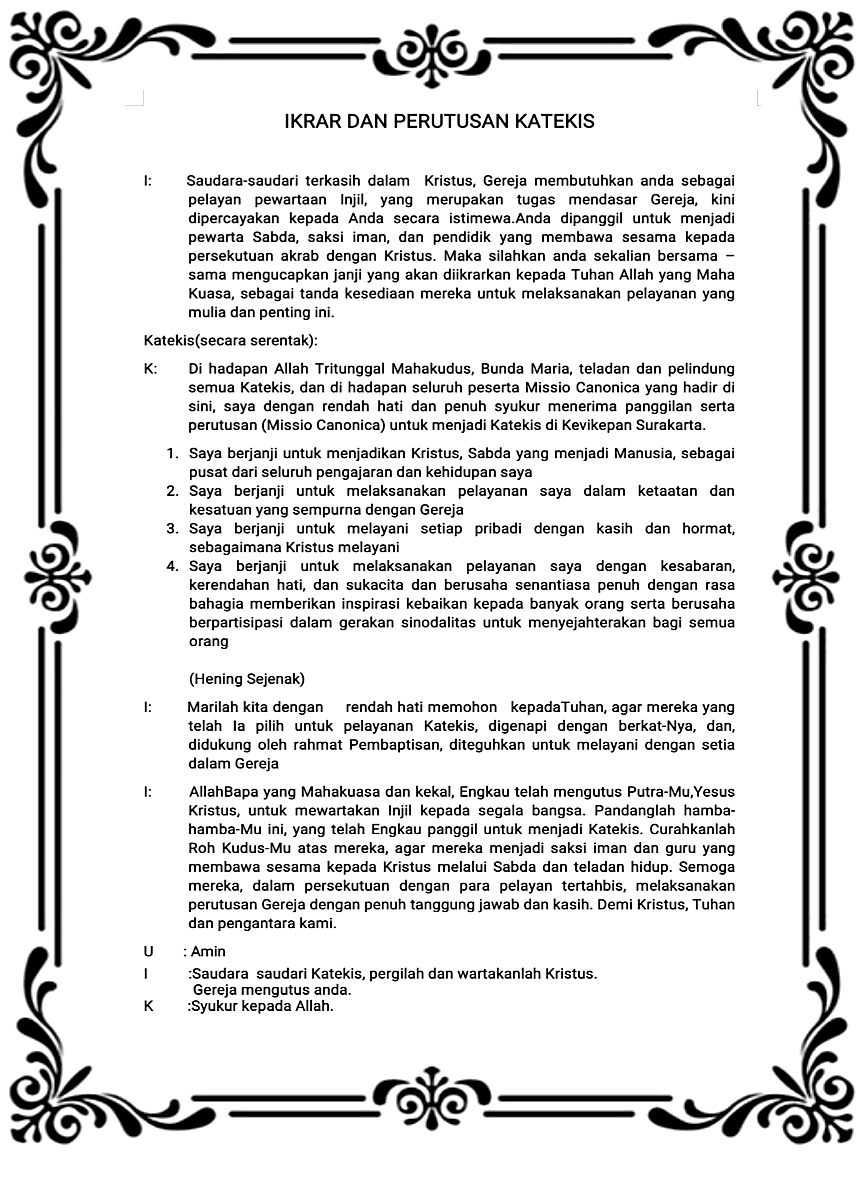 Sementara itu, Vikep Kevikepan Surakarta, Romo Herman Yosep Singgih Sutoro, Pr dalam homili menyampaikan bahwa para katekis dipanggil menjadi katekis dengan cara yang unik dan istimewa melalui orang tua, Romo, guru agama, atau melalui teman.